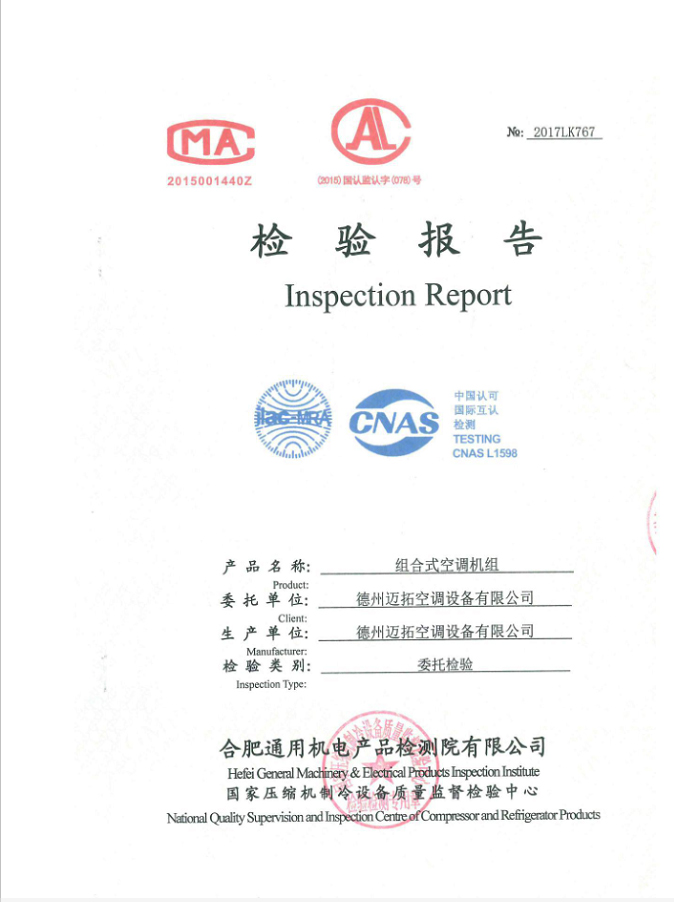 近日,該機組通過合肥通用機電產(chǎn)品檢測院有限公司(國家級審查認可的第三方檢查機構(gòu))檢測,完全符合GB/T14294-2008《組合式空調(diào)機組》的要求。